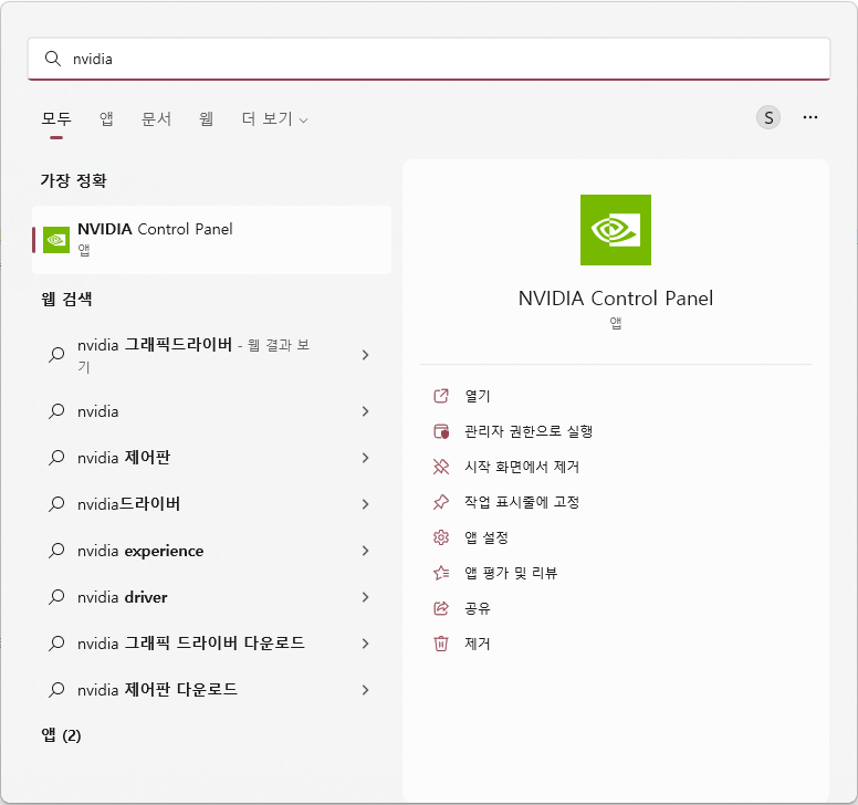 시스템 트레이에서 NVIDIA 제어판을 열거나 윈도우 앱 중 NVIDIA Control Panel을 찾아 실행합니다.