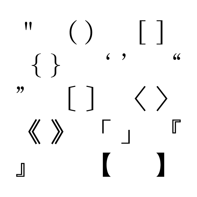 " ( ) [ ] { } ‘ ’ “ ” 〔 〕 〈 〉 《 》 「 」 『 』 【 】