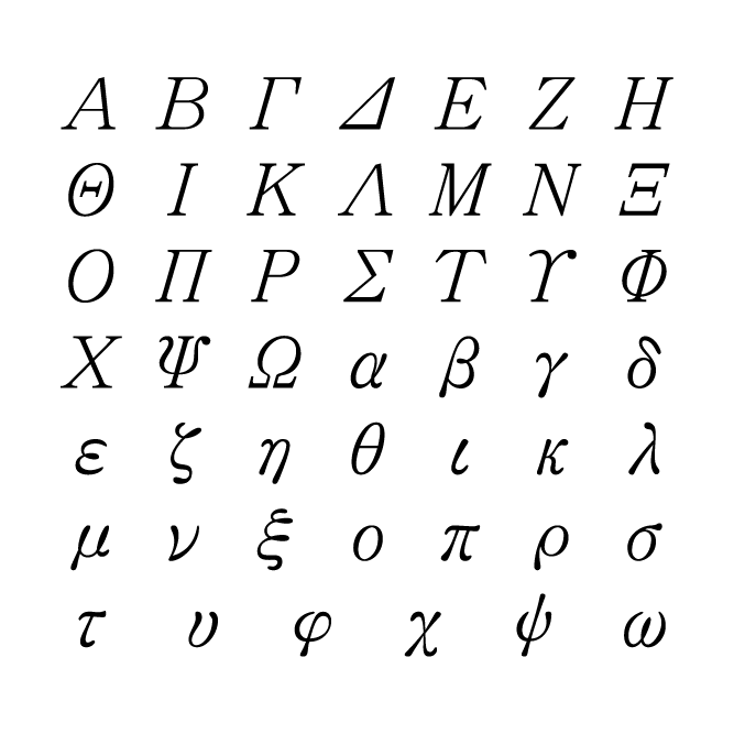 Α Β Γ Δ Ε Ζ Η Θ Ι Κ Λ Μ Ν Ξ Ο Π Ρ Σ Τ Υ Φ Χ Ψ Ω α β γ δ ε ζ η θ ι κ λ μ ν ξ ο π ρ σ τ υ φ χ ψ ω