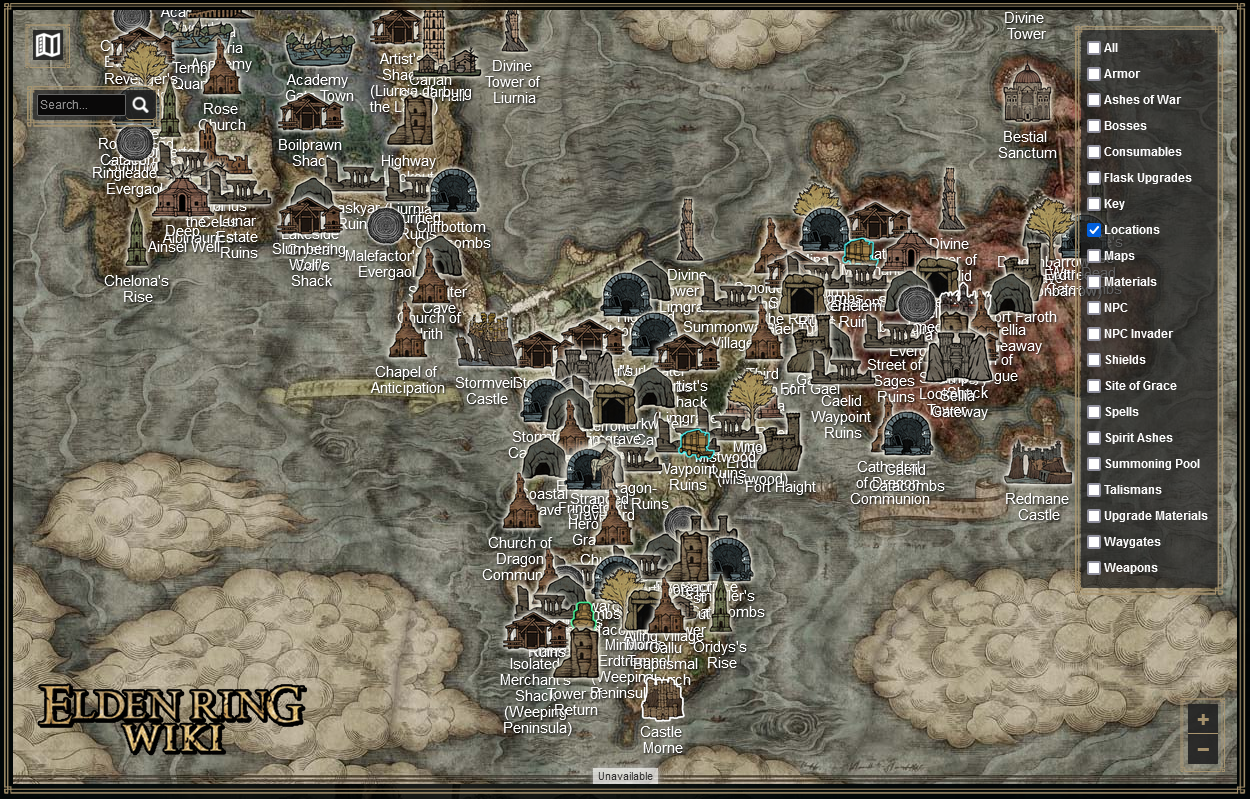 엘든링의 월드맵입니다. 지도 상에 표시하고 싶은 항목을 끄거나 켤 수 있고 위치나 보스, 아이템 등 표시 항목에 대한 짧은 설명도 볼 수 있습니다.(영어) 간혹 게임 내 실제 위치와 조금 다르게 표시되는 항목들도 있는데 아주 다르진 않고 주변을 조금만 둘러보면 찾을 수 있는 정도의 오차로 되어있습니다.