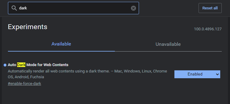 Search for dark in the search bar on the screen that appears. The appearance may change depending on the update, but an option to set the dark mode to 'force darkmode for webcontents' or 'auto darkmode for webcontents' appears. You can set Enabled, Disabled or other options to suit your situation.
