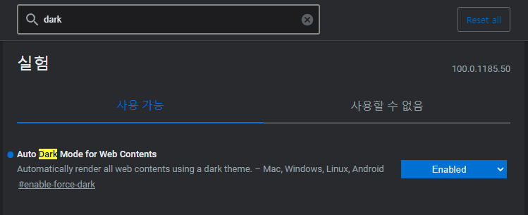 나타나는 화면의 검색 창에 dark 를 검색합니다. 업데이트에 따라 표현이 달라질 수도 있지만 'force darkmode for webcontents' 혹은 'auto darkmode for webcontents' 등으로 다크모드를 설정하는 옵션이 나타납니다. 활성(Enabled), 비활성(Disalbed) 혹은 다른 옵션을 자신의 상황에 맞게 설정하면 됩니다.